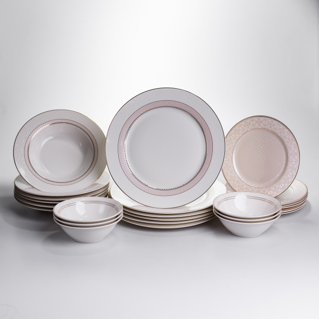 Столовий сервіз тарілок 24 штуки порцелянових на 6 персон. Цей набір столового посуду поєднує в собі стильний дизайн і якість. Він стане вашим надійним помічником у сервіруванні столу як для повсякденних трапез, так і для святкових застіль. Діаметр тарілок 14 см; 19 см; 22 см; 27 см; Об'єм глибокої тарілки: 300 мл. Основні переваги сервізу Універсальність: підходить як для повсякденного використання, так і для святкових застіль. Довговічність: порцеляна — це міцний і зносостійкий матеріал, який слугуватиме вам довгі роки. Естетичність: набір стане прикрасою вашого столу. Безпека: порцеляна не містить шкідливих речовин і безпечна для здоров'я. Легкість у догляді: набір можна мити в посудомийній машині. Такий столовий сервіз стане практичним і стильним доповненням вашої кухні. Він допоможе красиво сервірувати стіл і створити затишну атмосферу як під час повсякденних обідів, так і на святкових зустрічах із близькими. Набір поєднує в собі елегантний дизайн, міцність і зручність у використанні, тому стане чудовим вибором як для власного дому, так і як подарунок.