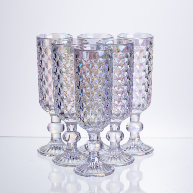 Набір келихів для шампанського виготовлений із прозорого товстого скла з ребристою фактурою. Класичний формат підходить для подачі ігристих напоїв, води або коктейлів у побутових умовах чи в закладах громадського харчування. Комплект містить 6 штук, достатньо для невеликої компанії. Кожен келих має висоту 18 см та обʼєм 160 мл — оптимальні розміри для стандартної порції шампанського. Верхній діаметр становить 5.5 см, що забезпечує зручність під час використання. Завдяки товстому склу і загальній вазі 2 кг набір стійкий до пошкоджень і витримує часте миття. Завдяки поєднанню простоти форми та фактурної поверхні, келихи легко інтегруються в різні стилі сервірування. Підходить для домашніх колекцій і базового оснащення ресторанного посуду. Характеристики: Кількість: 6 штук Матеріал: скло Висота: 18 см Діаметр верхній: 5.5 см Обʼєм одного келиха: 160 мл Загальна вага набору: 2 кг