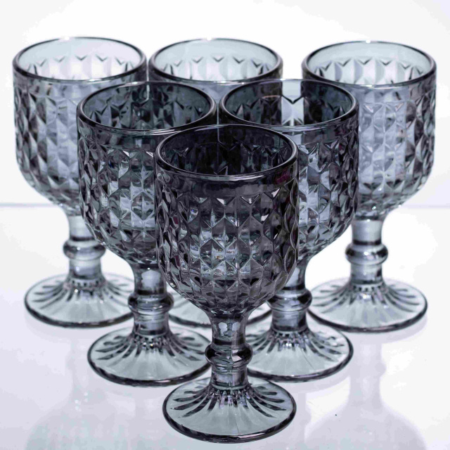 Елегантний набір чарок у графітовому кольорі з виразною алмазною гранню. Стильний аксесуар для сервірування столу, який відмінно поєднується із сучасним посудом та доповнює подачу міцних напоїв. Особливості: Фактурний дизайн: Глибокий рельєфний візерунок по всьому периметру створює гарну гру світла та робить чарки стійкими у руці. Графітовий відтінок: Темне тоноване скло виглядає солідно та сучасно. Практична форма: Зручна ніжка і чаша, що розширюється, роблять використання комфортним. Характеристики: Матеріал: скло Об'єм: 50 мл Висота: 10 см Діаметр: 4,5 см Вага: 800 г