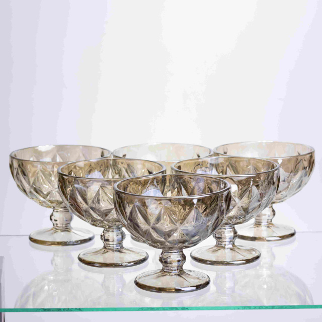 Елегантні креманки із тонованого скла у теплому бурштиновому відтінку. Ідеально підходять для порційної подачі десертів, морозива чи фруктових салатів, створюючи атмосферу затишку при будь-якому сервіруванні. Особливості: Бурштиновий відтінок: Насичений медово-золотистий колір скла надає десертам апетитного вигляду та гарно підсвічується при денному або вечірньому освітленні. Декоративне огранювання: Виразний візерунок по всій чаші не тільки тішить око, але й забезпечує надійне захоплення, коли креманка в руці. Практична форма: Оптимальний об'єм 300 мл дозволяє зручно сервірувати різні страви, а стійка ніжка гарантує стабільність. Характеристики: Матеріал: скло Об'єм: 300 мл Розміри (діаметр/висота): 11,8/13 см Вага: 2 кг