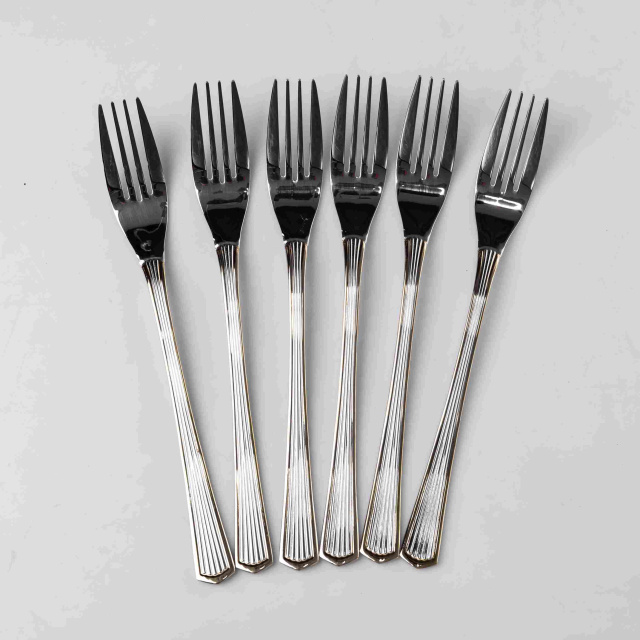 Столові прибори із дзеркальним поліруванням, виконані в класичному стилі. Призначені для повсякденного та святкового сервірування столу. Особливості: Матеріал: Нержавіюча сталь. Сплав стійкий до корозії та механічного впливу, не змінює смак та аромат страв. Полірування: Дзеркальна обробка поверхні забезпечує гладкість та блиск виробів. Ергономіка: Довжина прибору становить 20,5 см. Геометрія зубців та вага виробу розраховані на комфортне використання з іншими стравами та закусками. Догляд: Прибори підходять для очищення в посудомийній машині. Поверхня стійка до стандартних миючих засобів. Характеристики: Матеріал: нержавіюча сталь Довжина: 20,5 см Вага набору: 200 г