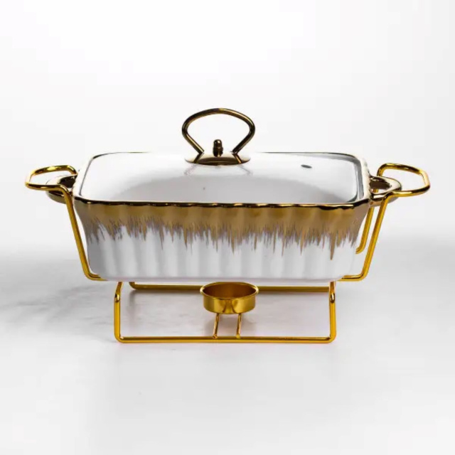 Мармітниця порцелянова прямокутної форми призначена для подачі гарячих страв із підтриманням температури під час сервірування. Завдяки металевій підставці з підігрівом від двох свічок-таблеток страва довше залишається теплою без використання електроенергії. Скляна кришка дозволяє контролювати вміст без необхідності відкривання. Об’єм 1 л підходить для подачі гарнірів, других страв або закусок. Порцелянова ємність добре утримує тепло, а металева підставка золотистого кольору забезпечує стійкість та рівномірний підігрів. Прямокутна форма дозволяє раціонально використовувати простір на столі. Конструкція розбірна, що спрощує очищення та зберігання. Завдяки продуманим розмірам і вазі мармітниця зручна для щоденного використання або сервірування під час прийому гостей. Характеристики: Форма: прямокутна Матеріал ємності: порцеляна Матеріал кришки: скло Матеріал підставки: метал Колір підставки: золотистий Об’єм: 1 л Джерело підігріву: 2 свічки-таблетки Висота: 11 см Ширина: 16 см Довжина: 31 см Вага: 1.7 кг