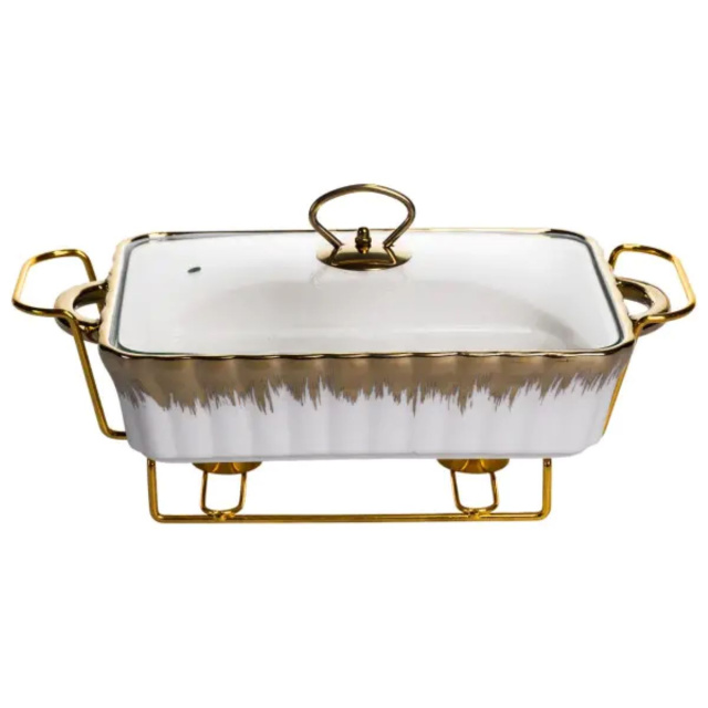 Мармітниця порцелянова прямокутної форми призначена для подачі та підтримання температури гарячих страв під час сервірування. Білий колір у поєднанні з акуратною золотою окантовкою робить виріб універсальним для використання як у домашніх умовах, так і в ресторанному або банкетному форматі. Прямокутна форма зручна для розміщення на столі та ефективного використання простору. Мармітниця виготовлена з високоякісної порцеляни, яка забезпечує рівномірне нагрівання та добре зберігає тепло. Прозора скляна кришка дозволяє контролювати вміст без відкривання, що допомагає мінімізувати втрату температури та зберегти охайний вигляд страви під час подачі. Мармітниця комплектується металевою підставкою з підігрівом, яка працює від свічок-таблеток. Така конструкція дозволяє підтримувати оптимальну температуру страви без використання електрики, що зручно для фуршетів, банкетів і виїзних заходів. Підставка забезпечує стійкість та розрахована на регулярне використання. Характеристики: Тип виробу: мармітниця Форма: прямокутна Матеріал чаші: порцеляна Колір: білий Оздоблення: золота окантовка Кришка: скляна, прозора Підставка: металева Тип підігріву: від свічок-таблеток