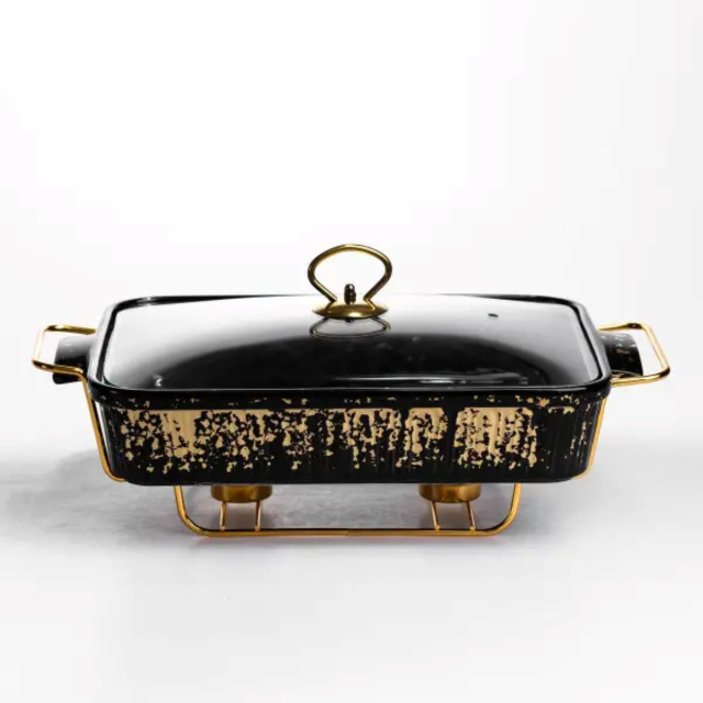 Мармітниця порцелянова чорного кольору об’ємом 2 л забезпечує зручну подачу гарячих страв та соусів на стіл. Прямокутна форма поєднується зі скляною кришкою, що дозволяє контролювати стан страви під час подачі. Золотиста металева підставка додає стабільності і оснащена підігрівом від однієї свічки-таблетки, що допомагає підтримувати оптимальну температуру страви. Висота мармітниці становить 15.5 см, ширина – 22,5 см, а довжина – 40 см, що робить її компактною та зручною для сервірування навіть на невеликому столі. Вага виробу 3.1 кг забезпечує надійне утримання без ризику перекидання. Чорний колір порцеляни додає виробу стриманого та сучасного вигляду, який легко вписується в будь-який інтер’єр. Простий механізм підігріву від свічки-таблетки дозволяє швидко підготувати мармітницю до роботи та підтримувати температуру страви без використання електрики. Цей виріб зручний для буденного використання і підходить для подачі різних гарячих страв, закусок та соусів, роблячи сервірування більш організованим та акуратним. Характеристики: Об’єм: 2 л Матеріал: порцеляна, металева підставка Підігрів: від 1 свічки-таблетки Висота: 15.5 см Ширина: 22,5 см Довжина: 40 см Вага: 3.1 кг