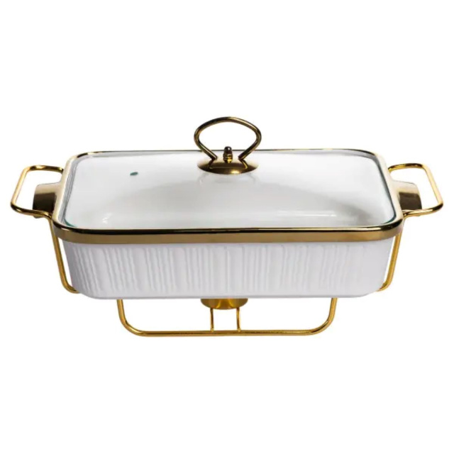 Мармітниця порцелянова прямокутної форми виконана в нейтральному білому кольорі, що легко поєднується з різними стилями сервірування. Виріб призначений для подачі та підтримання температури гарячих страв під час сімейних обідів, святкових подій або професійного використання. Прямокутна форма дозволяє зручно розміщувати мармітницю на столі та ефективно використовувати простір. Мармітниця добре зберігає тепло та підходить для різних типів гарячих страв. Прозора скляна кришка дає змогу бачити вміст без відкривання, що допомагає зменшити втрату температури та зберегти зовнішній вигляд страви. Кришка легко знімається та зручна у догляді. Мармітниця встановлена на металевій підставці з золотистим покриттям, яка оснащена підігрівом від свічок-таблеток. Такий спосіб нагріву не потребує електрики та підходить для виїзних заходів, фуршетів і банкетів. Конструкція забезпечує стабільність та розрахована на регулярне використання. Характеристики: Тип виробу: мармітниця Форма: прямокутна Матеріал чаші: порцеляна Колір чаші: білий Кришка: скляна, прозора Матеріал підставки: метал Колір підставки: золотистий Тип підігріву: від свічок-таблеток